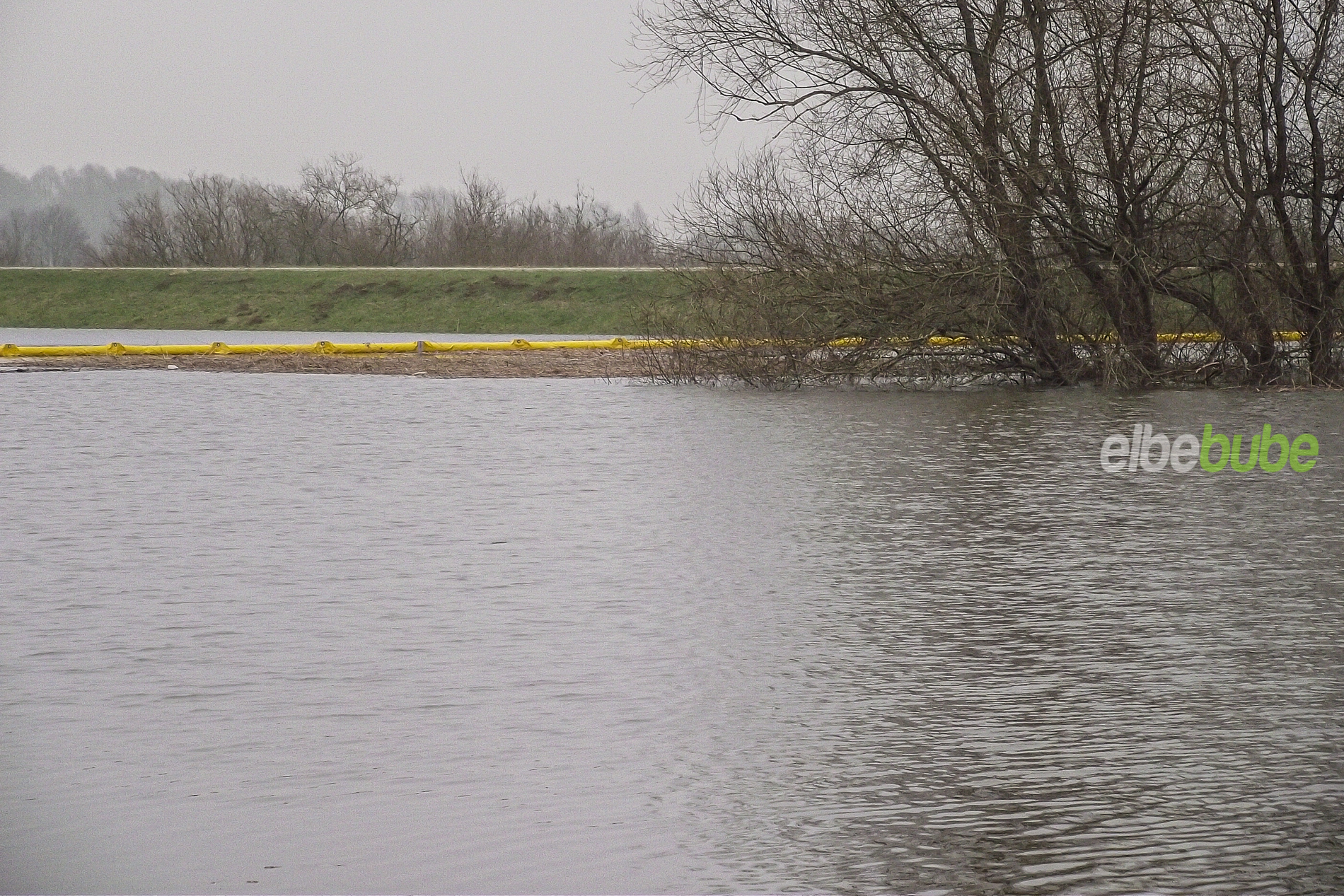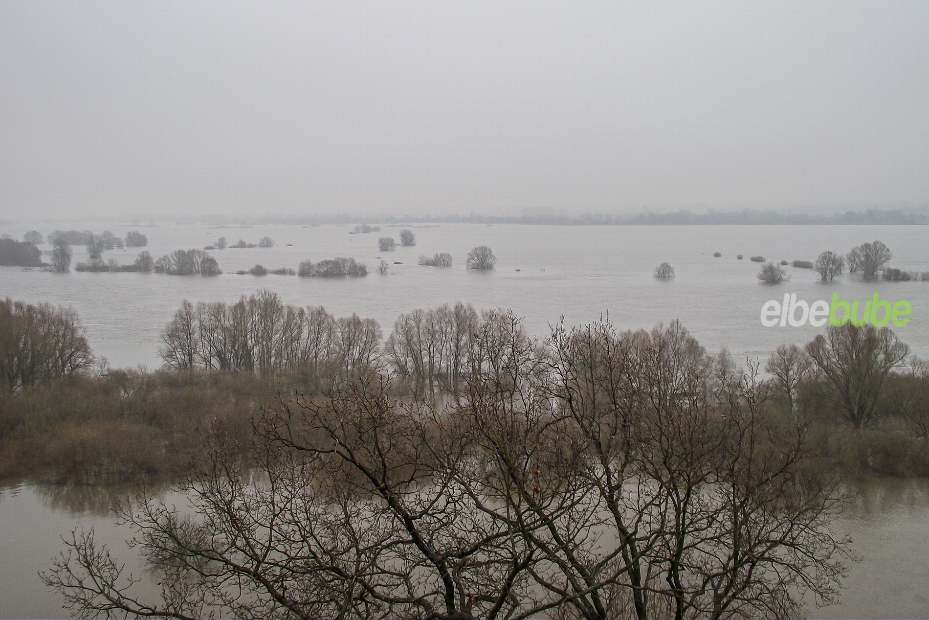 Das Elbehochwasser vom Januar 2011 im Hafen von Boizenburg, der Elbe mit Deich und Blick vom Aussichtsturm Vier auf die Flusslandschaft.