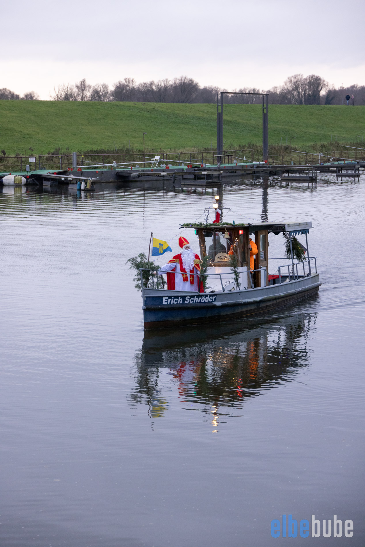 Mit etwas Verspätung erreichte der Nikolaus die Elbestadt Boizenburg. Um die erschwerliche Anfahrt etwas zu beschleunigen, übernahm der Hafenschlepper „Erich Schröder“ die Abschluss Etappe.
